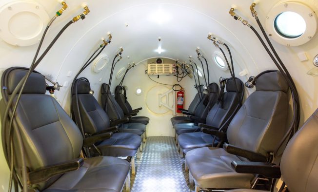 Oxigenoterapia é um tratamento em que há inalação de O2 pressurizado dentro de uma Câmara Hiperbárica.